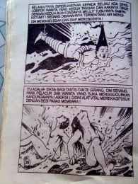 Komik ini sebenarnya adalah karya lama yang Antariksa ingat tidak berubah sejak tahun 1970an, kecuali mungkin bahasanya. (Oya, penerbitnya ternyata adalah penerbit Surabaya…) Produk-produk murahan ini—dijual dengan harga Rp. 2500-3000—adalah salah satu contoh mengenai bagaimana gagasan kita mengenai agama, mengenai kebenaran, berkait erat dengan apa yang terjadi di lingkungan sosial kita, dan masuk ke dalam citra visual.